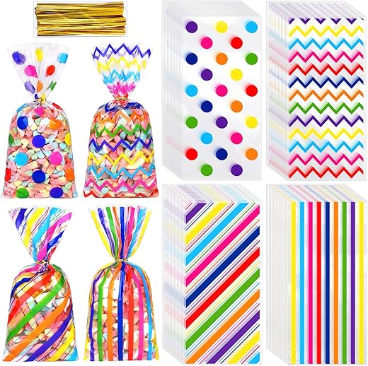 - What you will get: each package comes with 100 pieces of rainbow cellophane bags in 4 patterns, which include vertical stripes, wavy points, wavy stripes and diagonal stripes, classic and lovely, and the package comes with 100 pieces of gold twist ties to make your gifts more delicate and elegant for your party