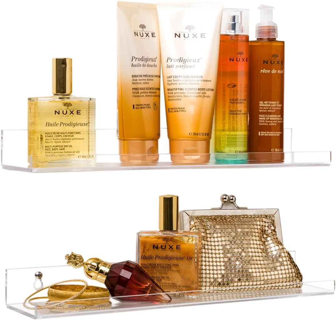 - [CRYSTAL-CLEAR TRANSPARENT ACRYLIC MATCHES YOUR DECOR] The ‘invisible’ bathroom organizer shelf easy to coordinate with your personal style. You can arrange each floating shelf anywhere it suits you best, side by side or tiered, to store your toiletries, makeup and perfume products at a convenient location, or at eye level making it easy to check your supplies with a glance, providing you with functional bathroom organization with a touch of style.