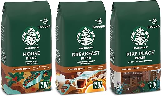 - PREMIUM GROUND COFFEE—Starbucks delivers exceptional coffee cup after cup with House Blend, Pike Place Roast and Breakfast Blend medium roast coffees. Each ground coffee bag is 12 ounces