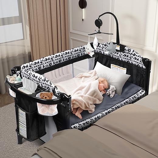 Xilingol 5-in-1 Pack and Play, Baby Bassinet Bedside Sleeper with Diaper Changer, Storage Bag & Music Box, Portable Baby Crib with Carry Ba…
